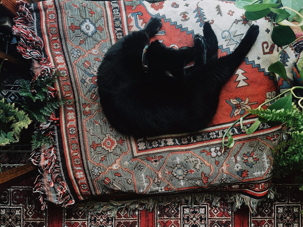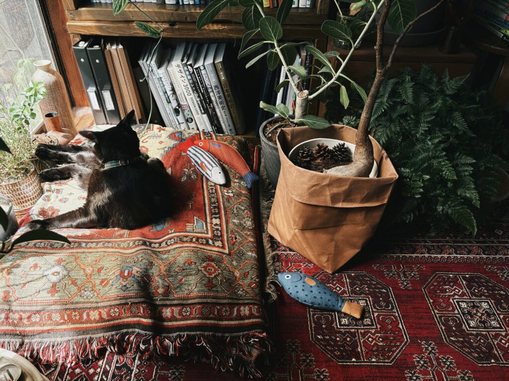 彼女にはいくつかの寝床があって、その時々で好きな時に好きな場所で過ごして貰っていますが、その中でもこの寝床はこれからの季節の多くの時間を過ごす場所です。なのでクッションを重ねてふかふかにして、彼女が思い切り体を伸ばしてもいいように広々としたベッドにしました。