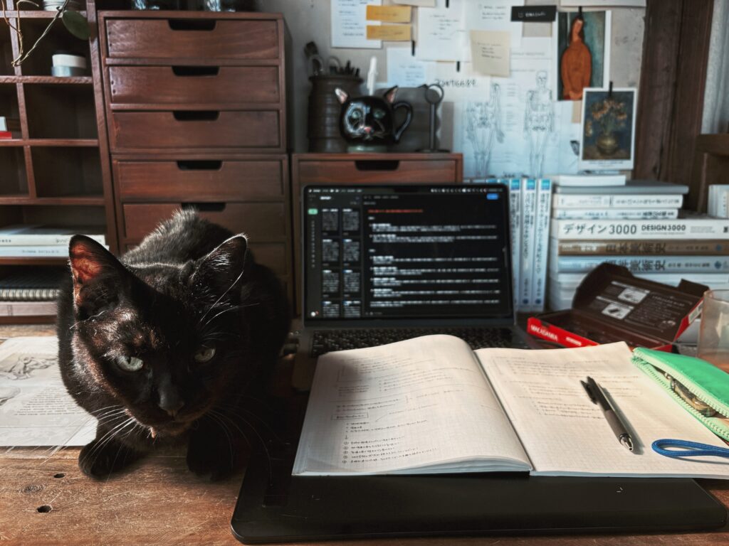 そんな愛猫ちゃんの日課は私の作業を妨害すること。一日に一回はこんな風に横にやってきて私の作業の手を止めます。