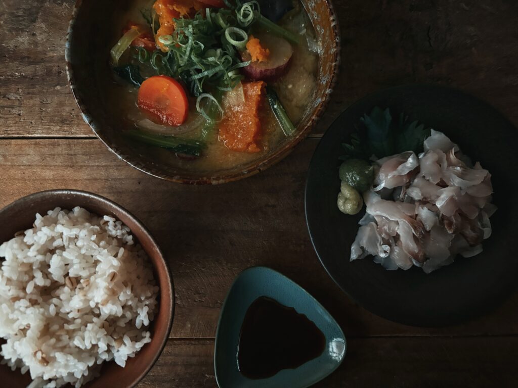 味噌汁には野菜をたくさん入れて、熱々をいただきます。