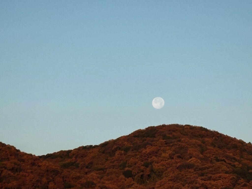 白んだ空に月が残っていて、紅葉した山々のとの対比がとても風流でした。美しいです。