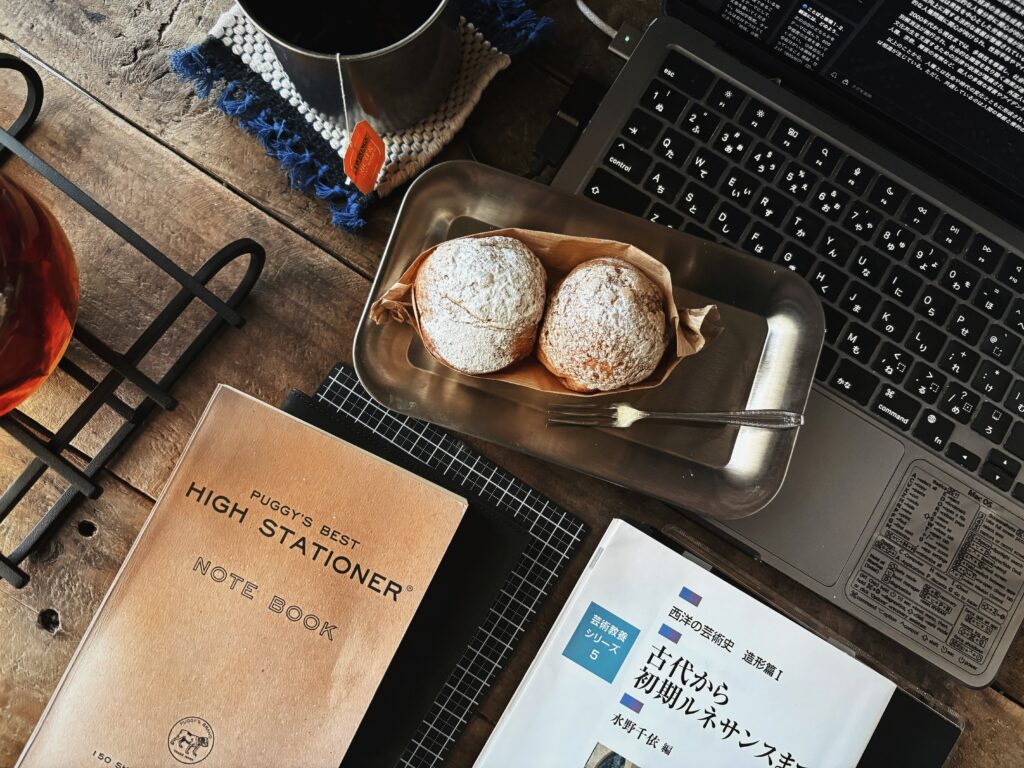 文献を読み込んでいる様子です。お供はカスタードがぎっしりと詰まったシュークリーム。
