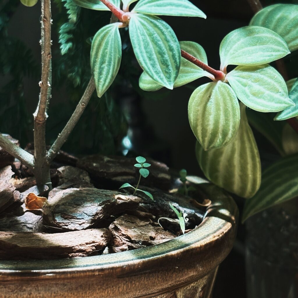こちらはデスクに置いているイボタの鉢。去年、外に出していたのでいつの間にか野草の種が入り込んでいたみたいです。小さな芽が顔を出しました。写真には写っていませんが、他にもぽつぽつ芽が出ています。