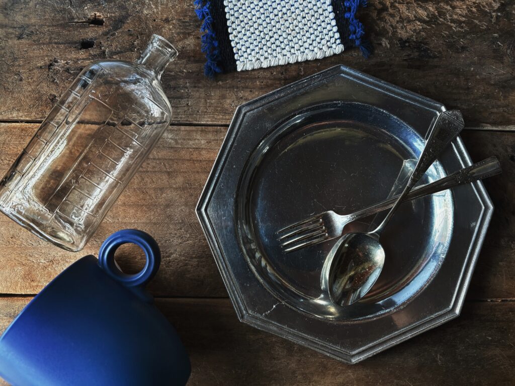 2枚目は蚤の市で購入したアンティークなテーブルウェアたち。8角形の銀のプレートは1ヶ月後に迫っている自分の40歳の誕生日プレゼントです。