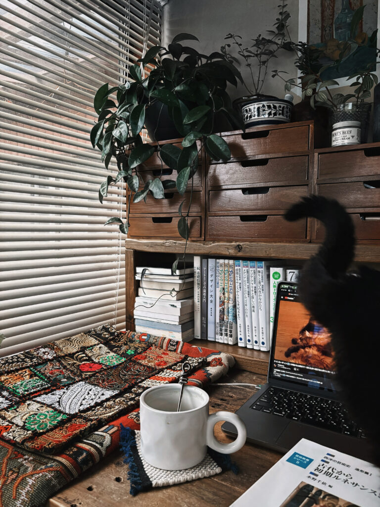 1枚目はインドのブルーポタリーの器。ケラチナミンやネイルオイルなどのハンドケア用品を入れてデスクに置いています。